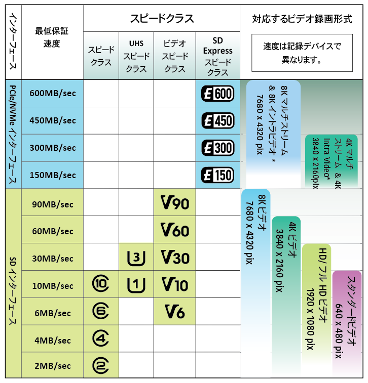 - ビデオスピードクラスにはV6,10,30,60,90があります。V6, 10はハイスピードおよびUHSバスIF製品、V30はUHSバスIF製品、V60とV90はUHS-IIおよびUHS-III バスIF製品に実装可能です。