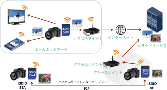 Wireless LAN SD規格は、IEEE 802.11(a/b/g/n)を搭載した機器、ホームネットワーク、SNSやクラウドサービスとSDメモリカード間でのワイヤレス通信を可能とする新しいSD規格として開発されました。