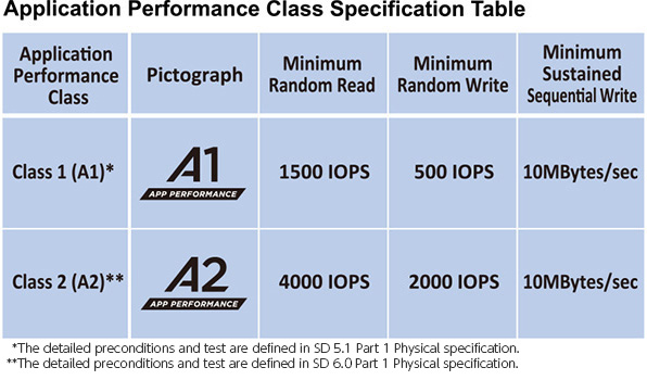 This table describes the Application Performance Class 1 (A1) and Class 2 (A2) specification and the minimum random read performance inputs/outputs per second (IOPS), minimum random write performance(IOPS) and the minimum sustained sequential performance (MB/s) of the corresponding SDHC/SDXC Memory Cards under the conditions defined in SD 5.1/SD 6.0 Part 1 Physical specification.