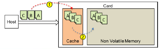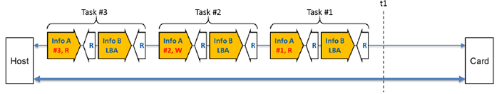 In the figure to the left (the controller structure), the controller has an SD interface driver to handle the task of command queue. In a command queue (the figure below), a host might use a voluntary CQ mode or sequential CQ mode. The SD interface driver is based on the task status (CMD13) and follows the priority to handle them (CMD46, CMD47). With the proper task controller by the SD interface driver, multiple tasks are handled at one time in arbitrary order. Moreover, the controller will locate the SRAM buffer to contribute high random performance by cache function, caching the host data during memory card access operations.