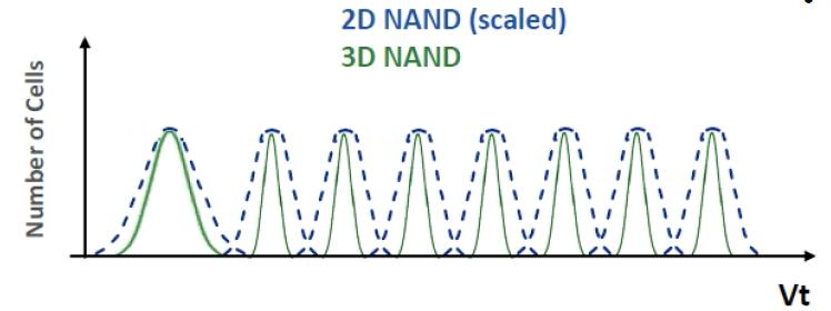 Retention loss, in which cells are not charged frequently, is an intrinsic NAND characteristic. Though there are debates on moving 2-D FG to 3-D FG or 3-D CT, users are still on the fence and stay with the 2-D FG for smaller-density, read-centric applications. Large-density users are tend to be write-intensive and benefit from the new technology.