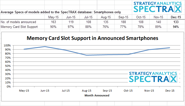 According to Strategy Analytics, in August 2015, 135 new phone models were announced, with 76 percent of them supporting memory cards; almost the same number of models was announced in December 2015 (133), but now 94 percent of them supported microSD cards. This is a trend to watch in the coming months.