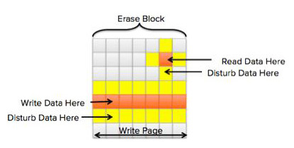 Another threat to data integrity is read/program disturb, an internal issue within the card architecture. Any device using NAND flash is vulnerable to read/disturb. Flash memory cells are one building block of an SD memory card’s architecture. Read/disturb occurs under read-intensive operation (such as reading maps for navigation/GPS), when a charge leaks across adjacent flash memory cells located in a row within architecture that contains written data. There are no safeguards in place to prevent a charge from leaking from the target cell to its neighboring cell. If the neighboring cell already has a charge, the leak can cause what is known as a disturb. Disturbs are problematic because if they are not identified and corrected, they can corrupt data. (see diagram on the right)