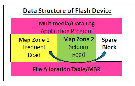 Fortunately, solutions are available to ward off read/disturb. First,certain algorithms inside of the card to mitigate these effects, checking cells at periodic intervals to ensure they are in the same state as they were previously. Second, if an unintentional change has occurred, auto refresh corrects errors to ensure charges are hitting target cells and data is correct. In order to take advantage of these features, it is imperative to purchase SD memory cards that integrate this technology into the design. (The diagram on the right illustrates various zones in an SD card that undergo intensive read operations)